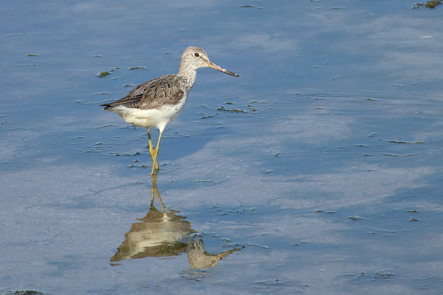 Ein Grünschenkel schreitet durch das Wasser wie auf einem Laufsteg.
