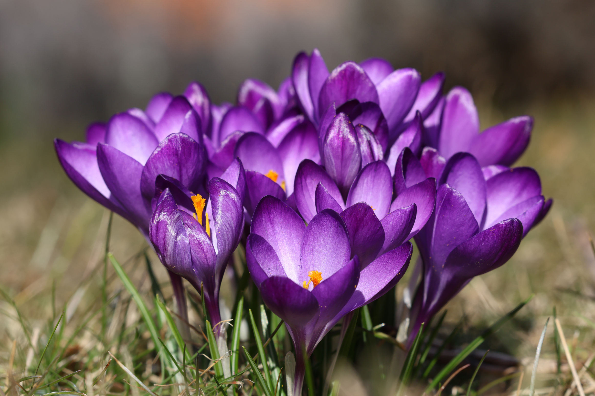 Das erste Bild der Reihenaufnahme einer Gruppe von Frühlingskrokussen.