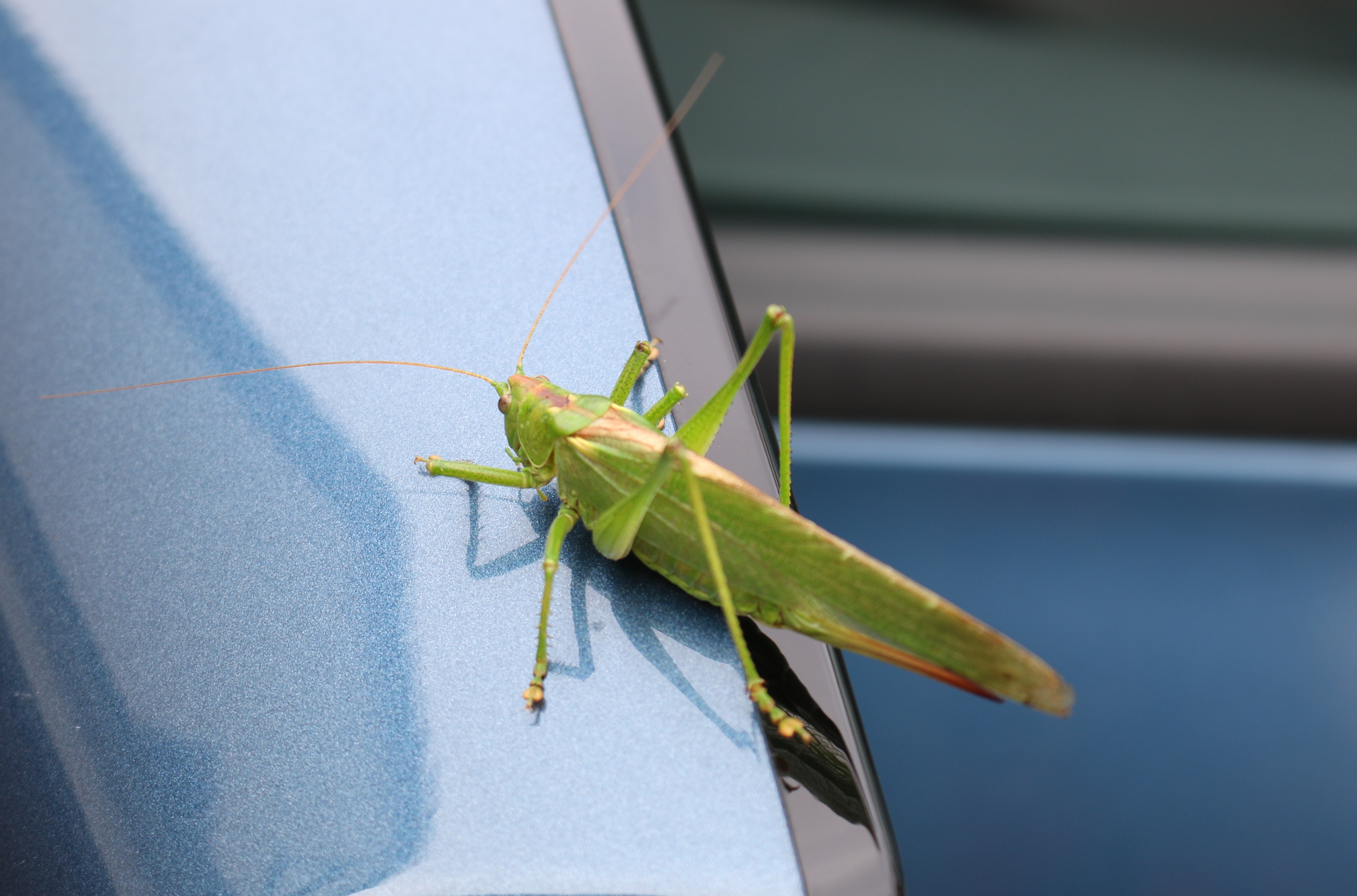 Ein Heupferd auf einem Außenspiegel meines Autos.