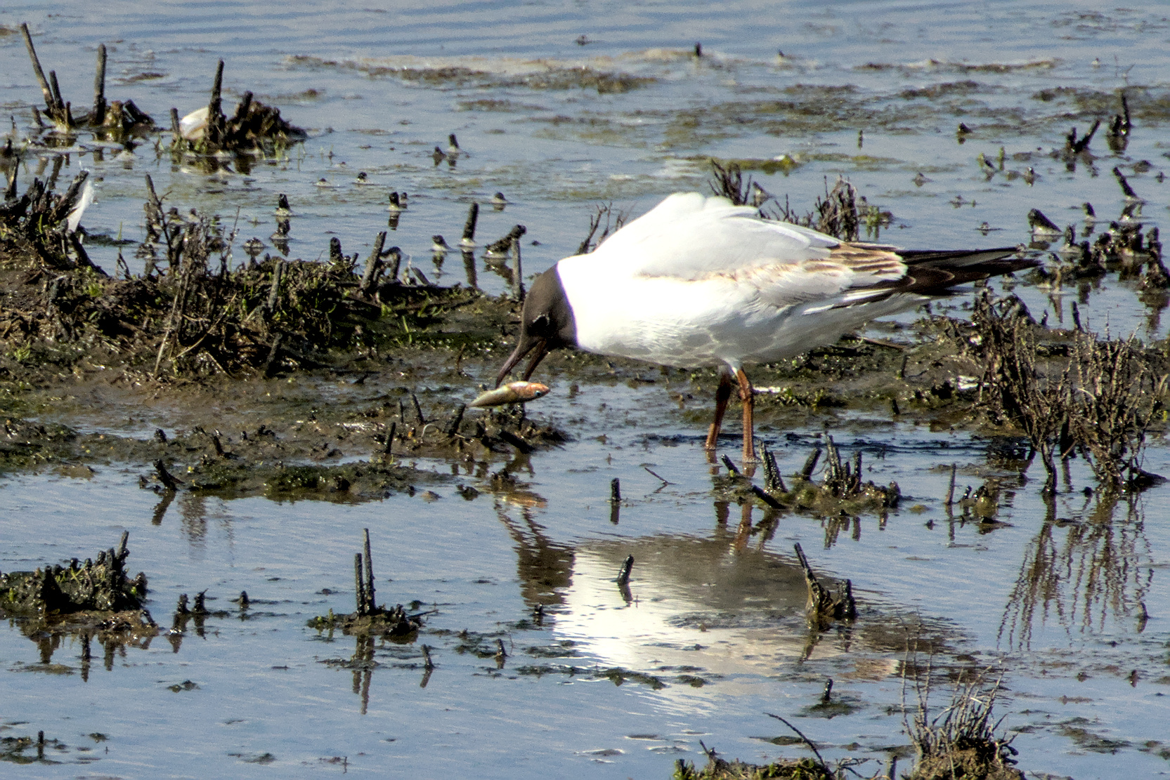 Eine Lachmöwe verspeist einen kleinen Fisch.