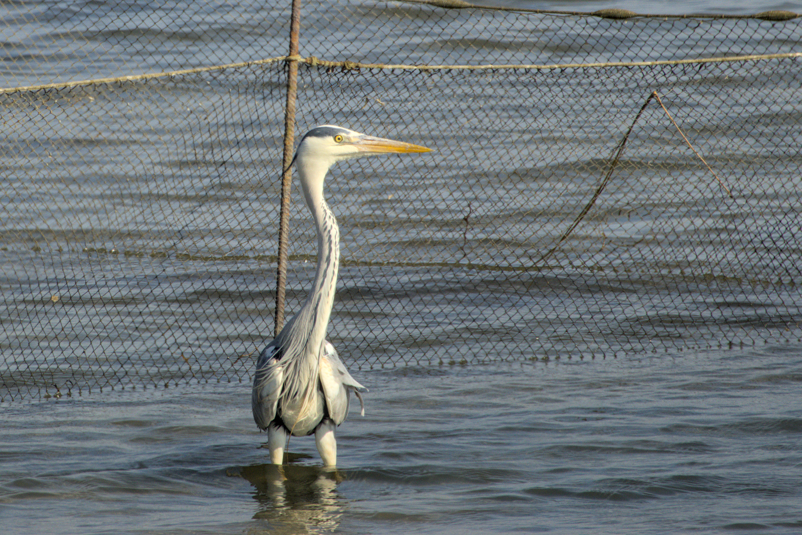 Ein 'zufriedener' Graureiher an einer Reuse.