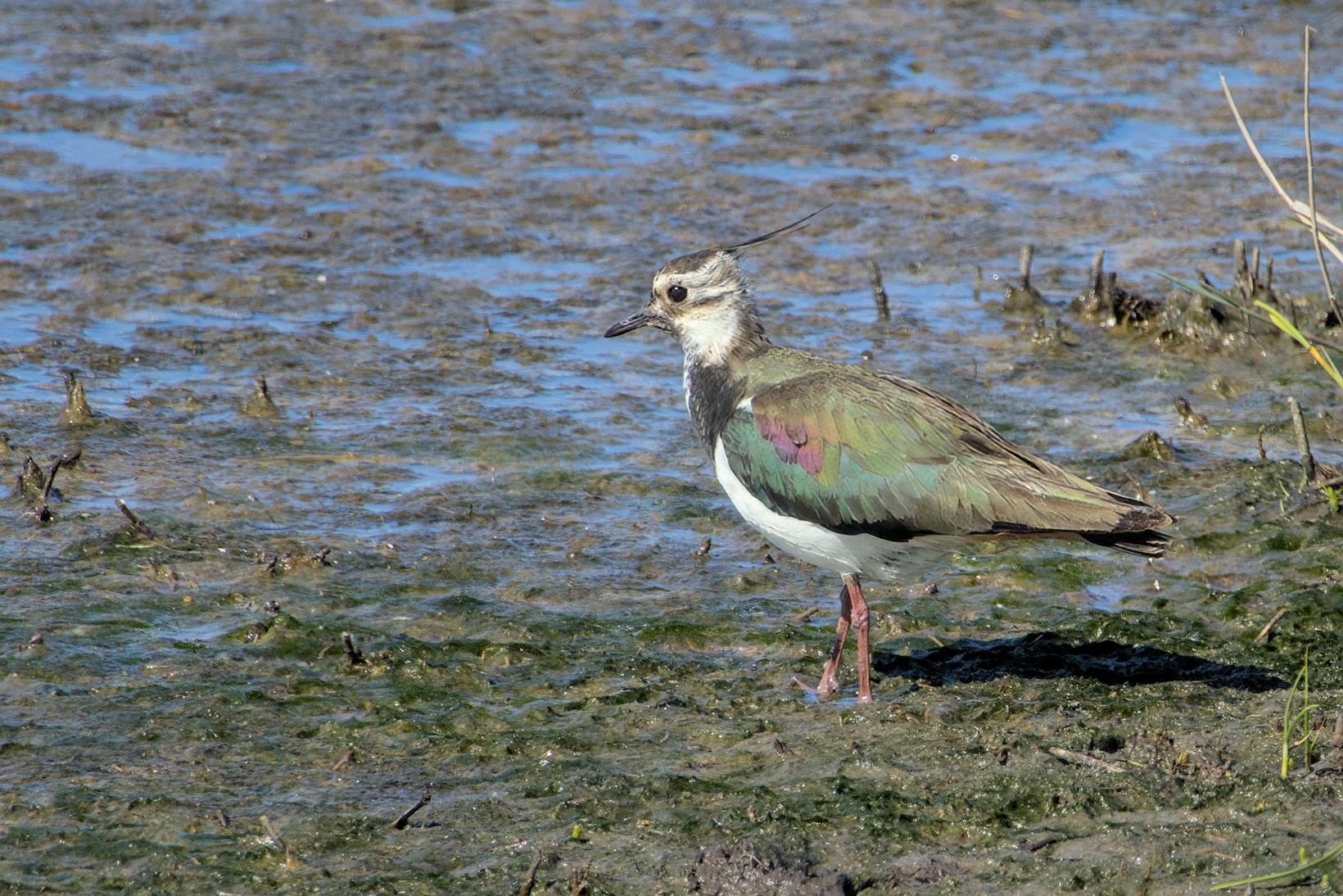 A Northern Lapwing walking through the mudflat.