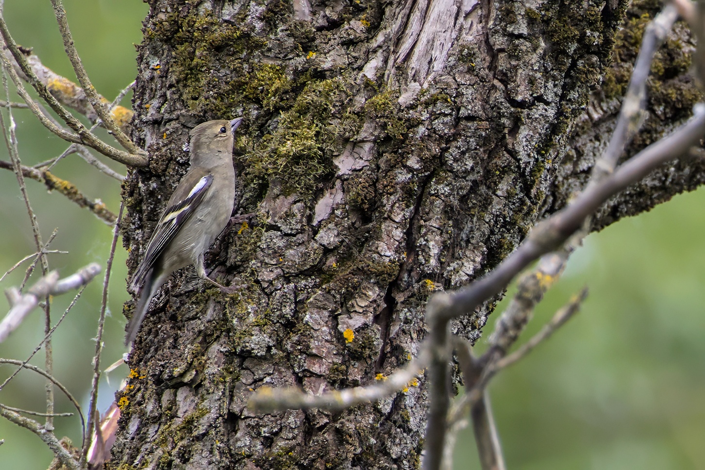 A Common Chaffinch jumping up a trunk of a tree.