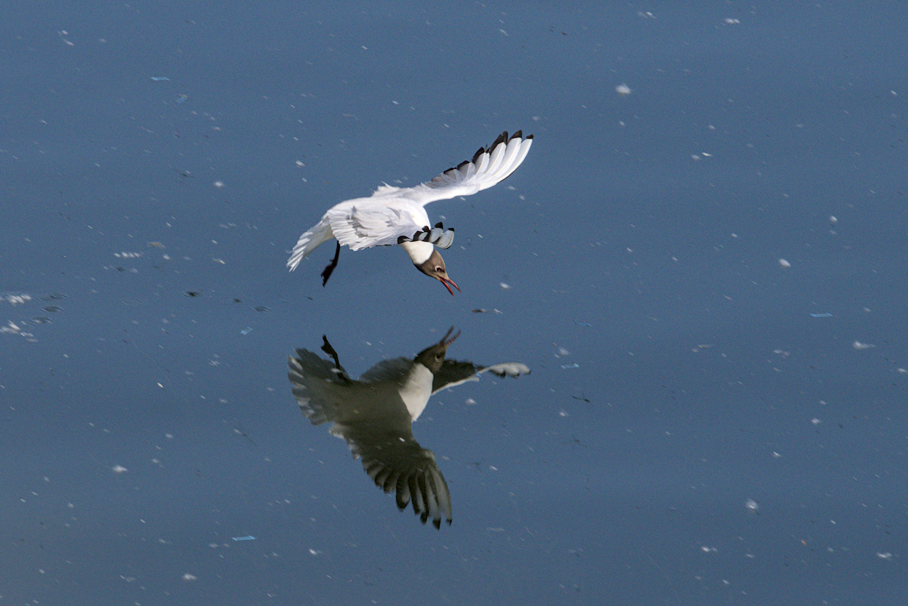 A Black-headed Gull aooroaching for 'lake kissing' while collecting insects.