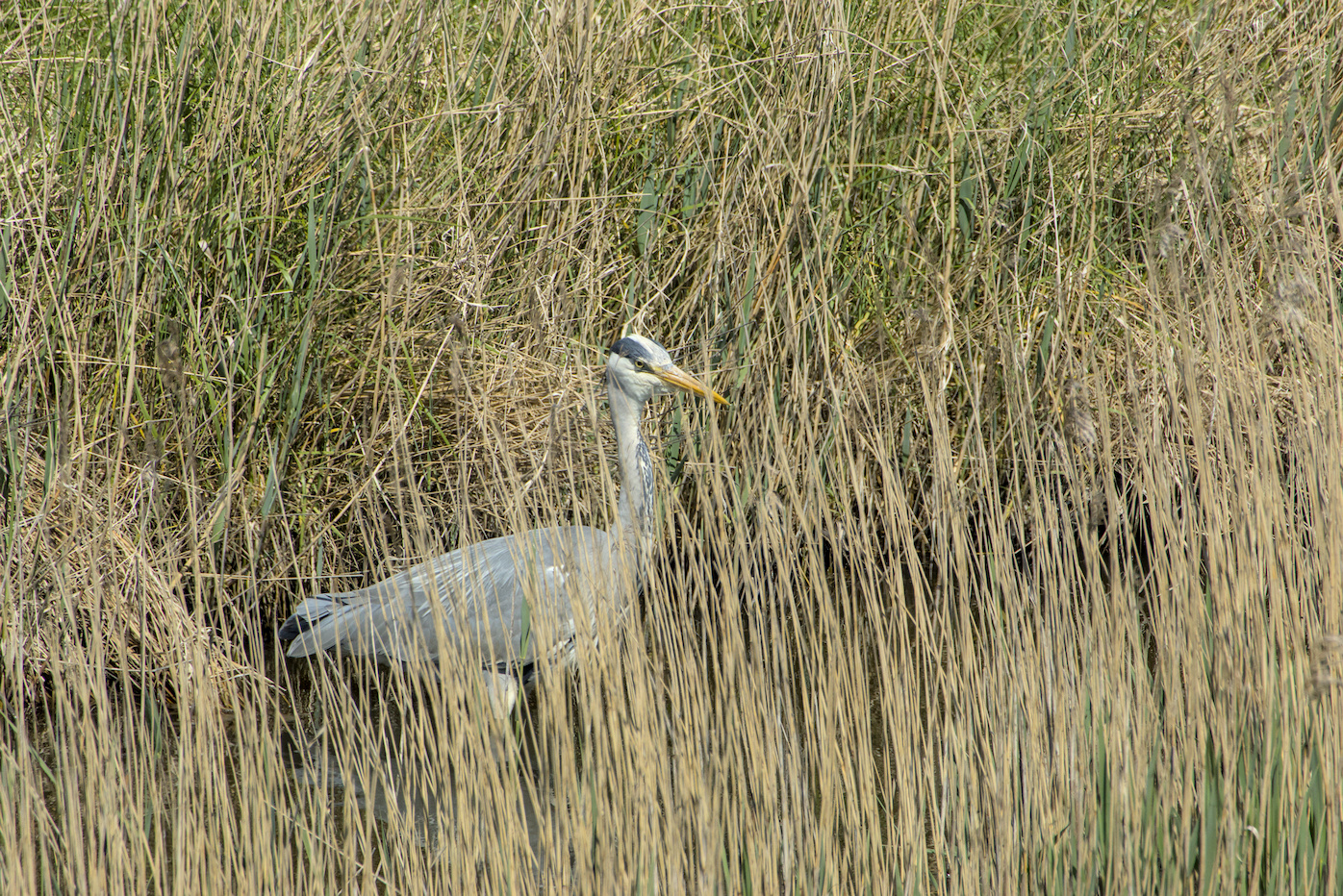 Ein Graureiher teilweise getarnt vom hohen Schilf.
