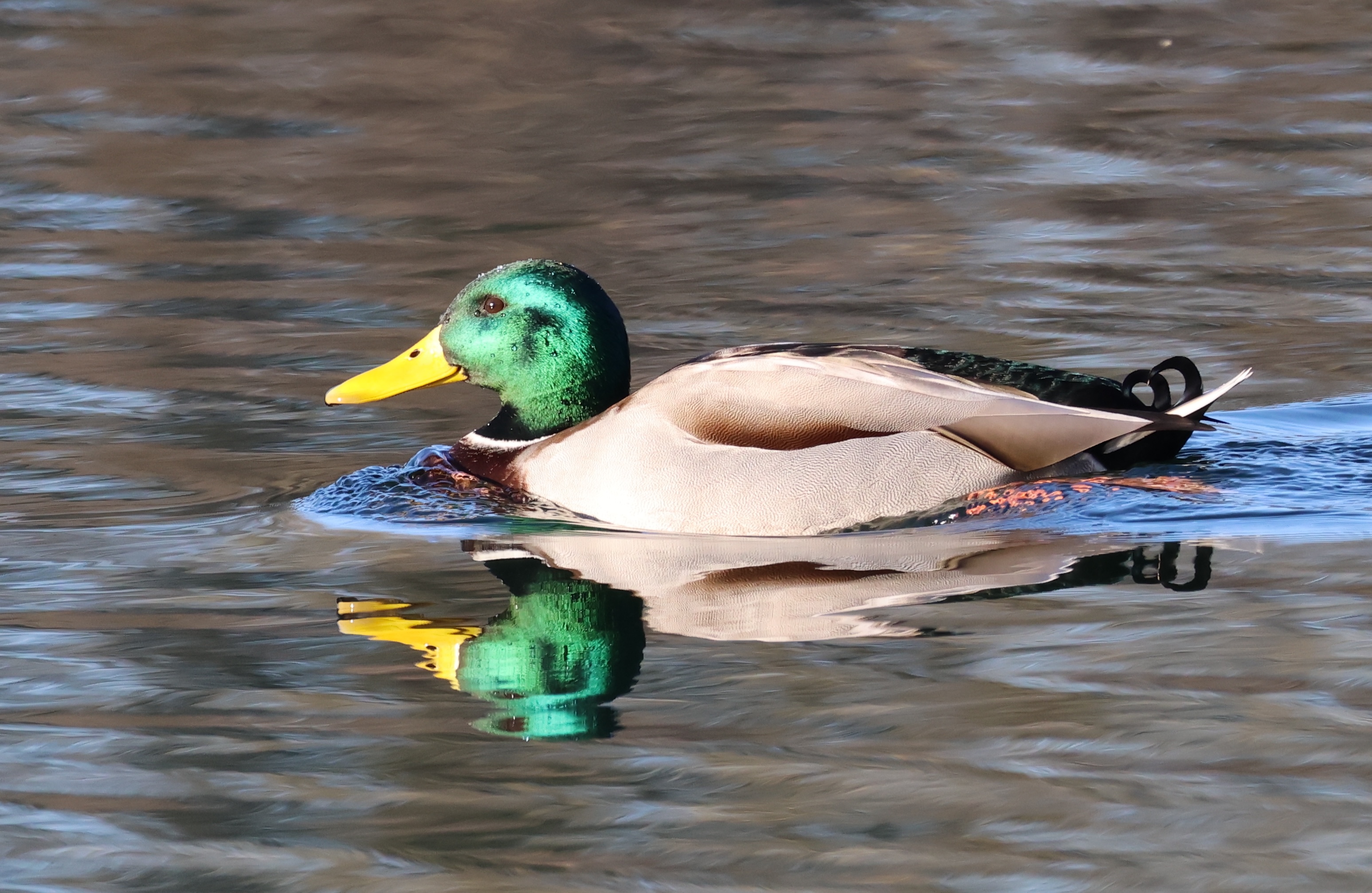 Eine männliche Stockente schwimmt gemächlich auf einem See.