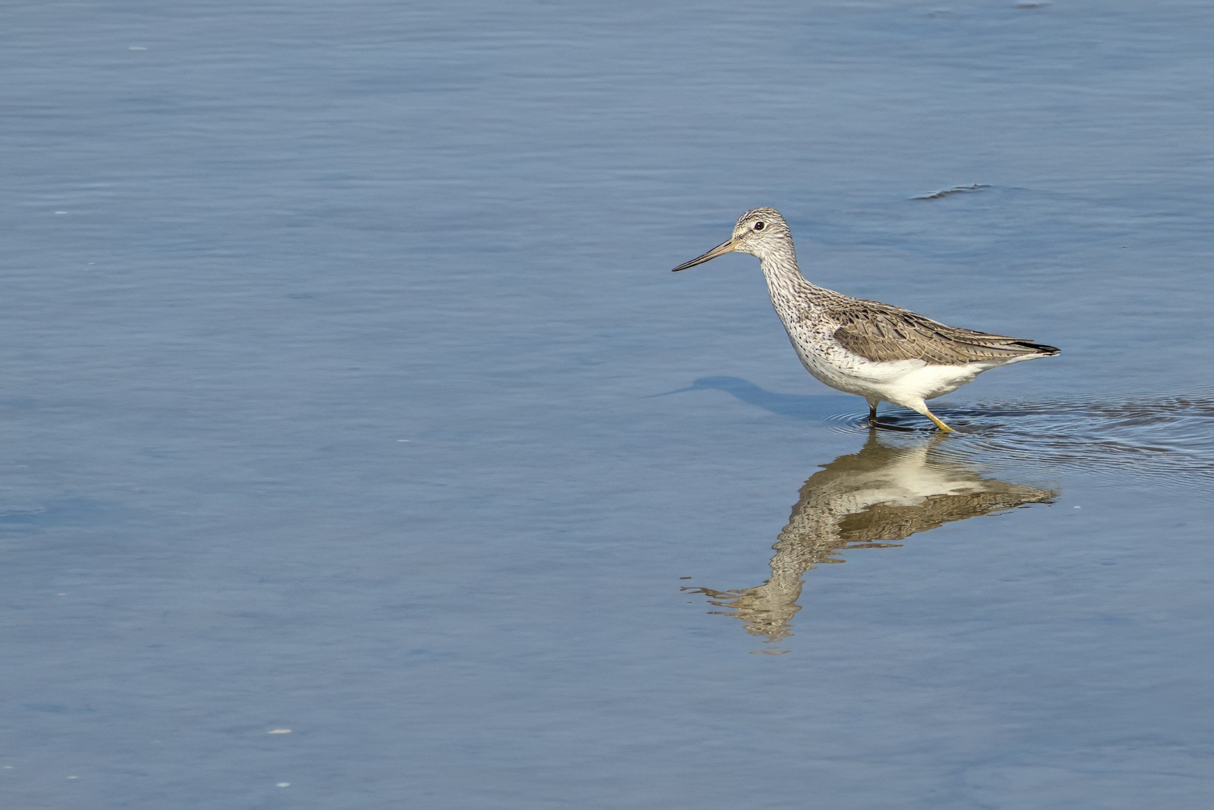 Ein Grünschenkel rennt durch seichtes Wattwasser.
