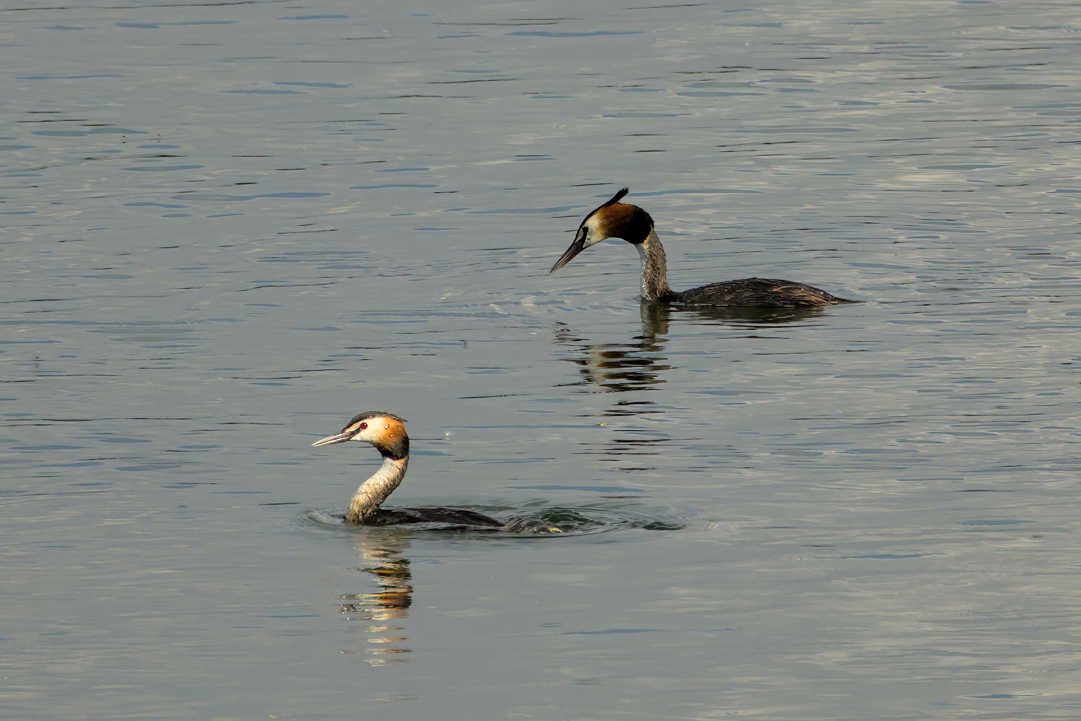 Two Great Crested Grebes of which one rises up, while the other initiates the next dive.
