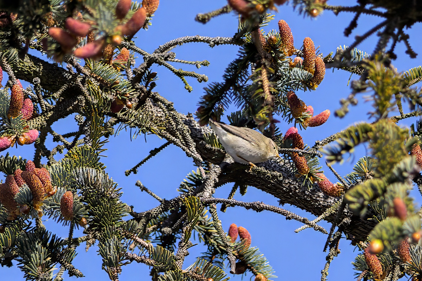 Ein Fitislaubsänger versucht sich auf einem Baum zu verstecken.