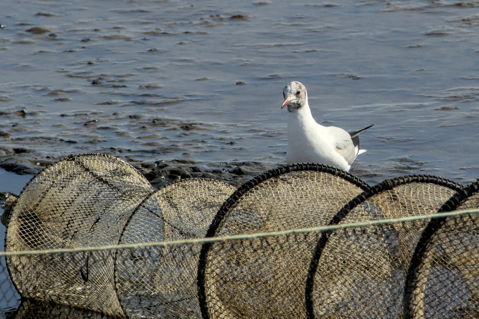 A Black-headed Gull inspecting a fish trap.