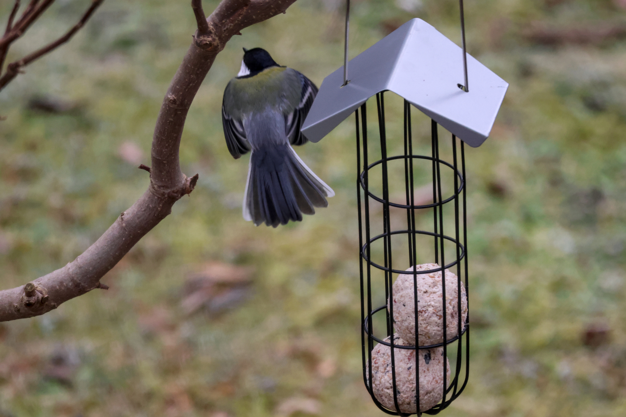 Eine Kohlmeise im Flug vom Futterspender weg.