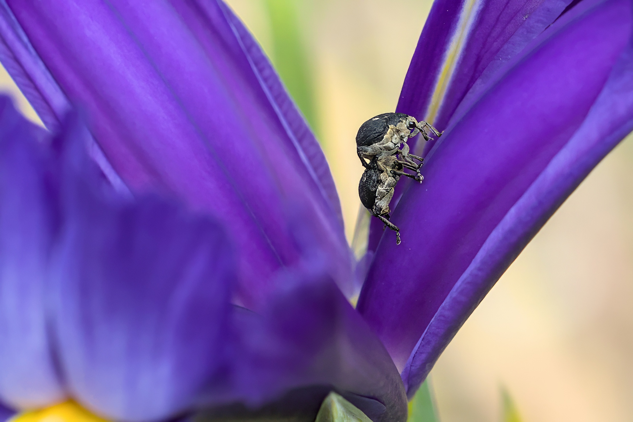 Zwei Weißpunktige Schwertlilienrüsslers auf einer Schwertlilie bei der Paarung.