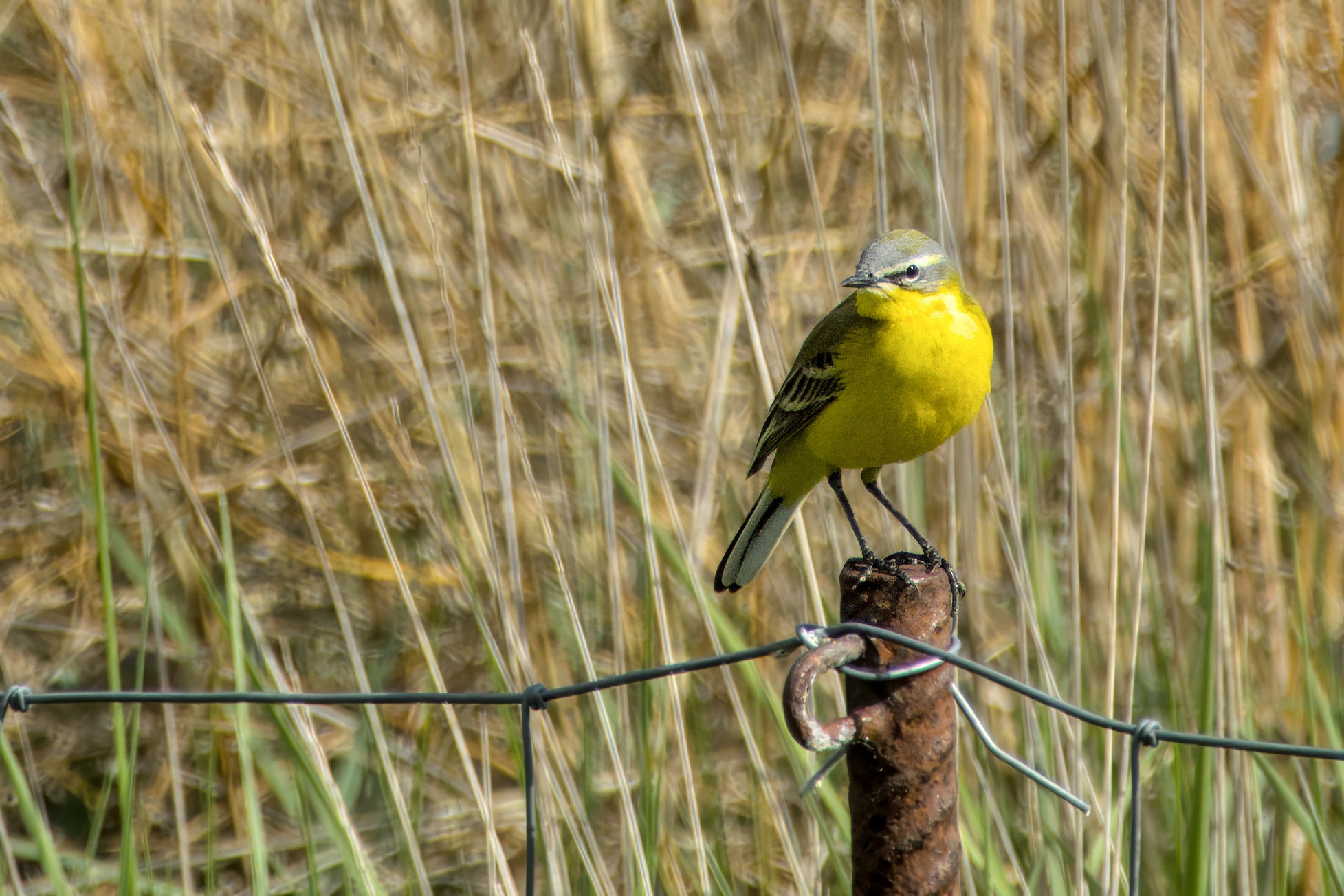 A Western Yellow Wagtail controling the border of the bird protection zone of the Rantum salt meadows on the island of Sylt.