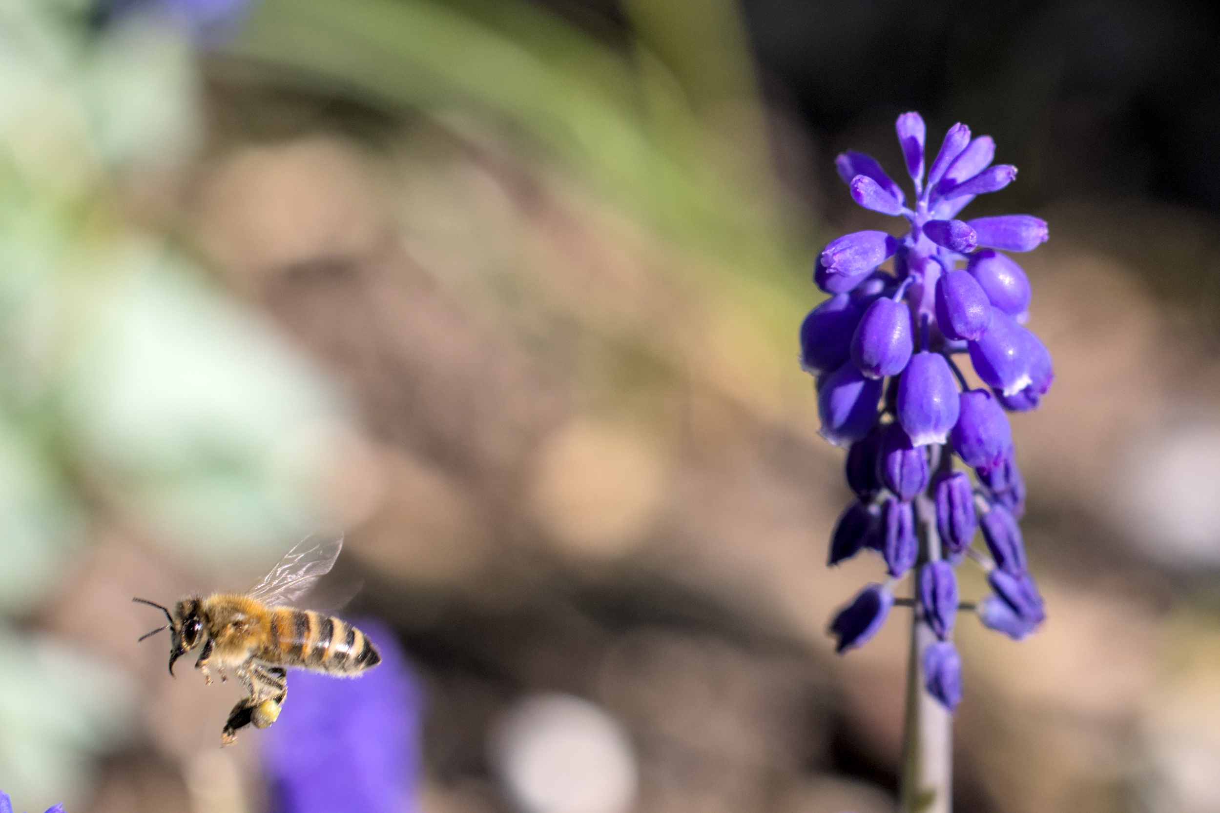 A Bee flying away from a Starch Grape-Hyacinth.