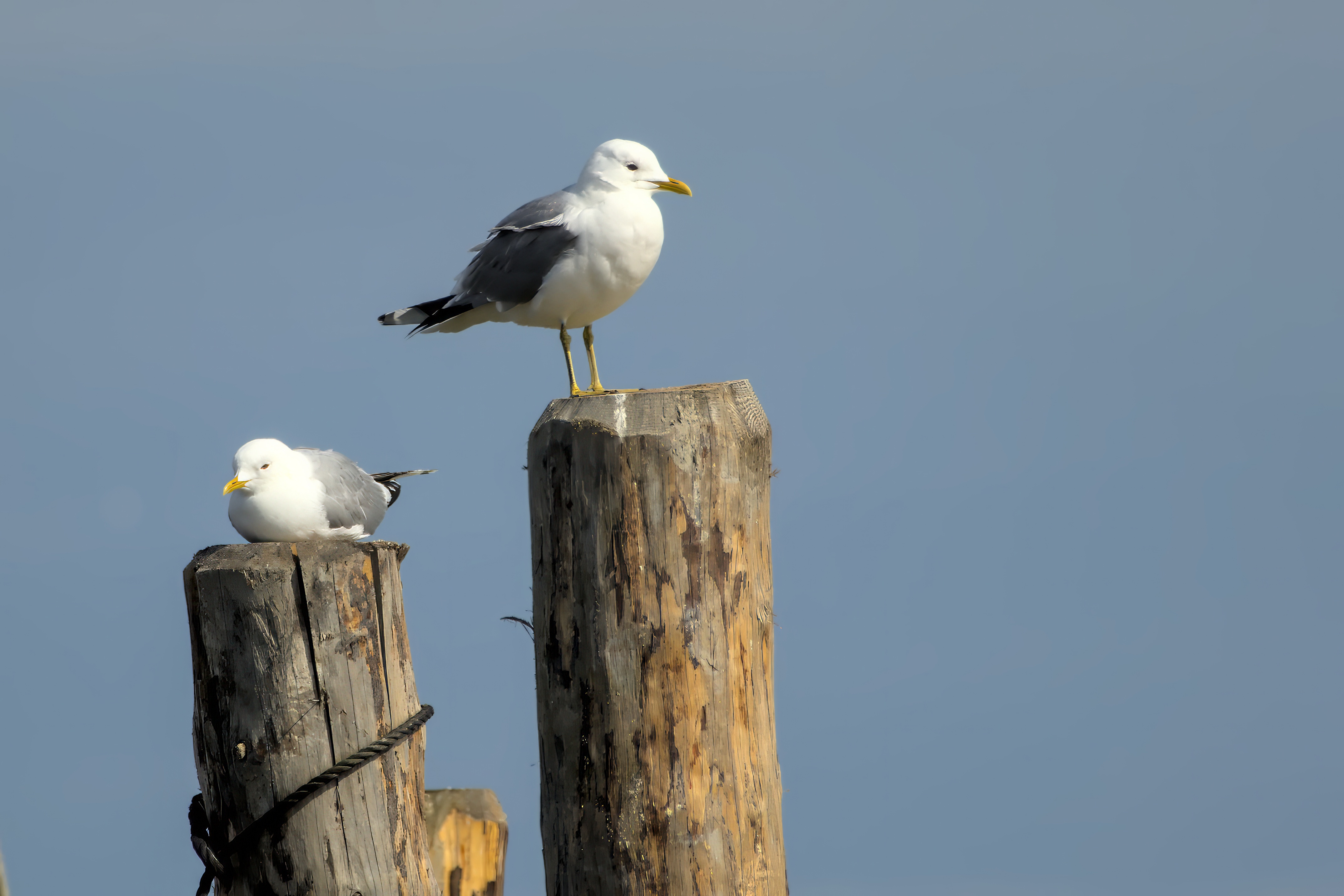 Zwei Sturmmöwen auf je einem Pfahl in einem Hafen.
